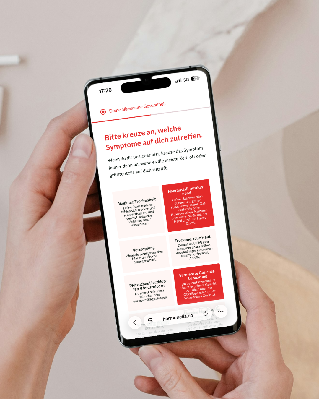 Unser Hormon-Check hilft dir, mögliche Zusammenhänge zwischen deinen Symptomen und hormonellen Ungleichgewichten zu erkennen. Nach dem Fragebogen erhältst du eine persönliche, auf dich zugeschnittene Auswertung.